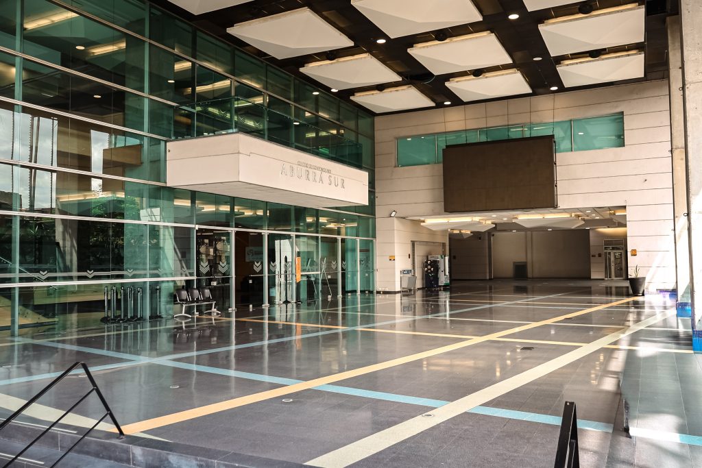 Un amplio hall que recibe a los visitantes, adornado con una fuente y una Plaza de la Lluvia que se integran al ambiente exterior del Centro de Convenciones.